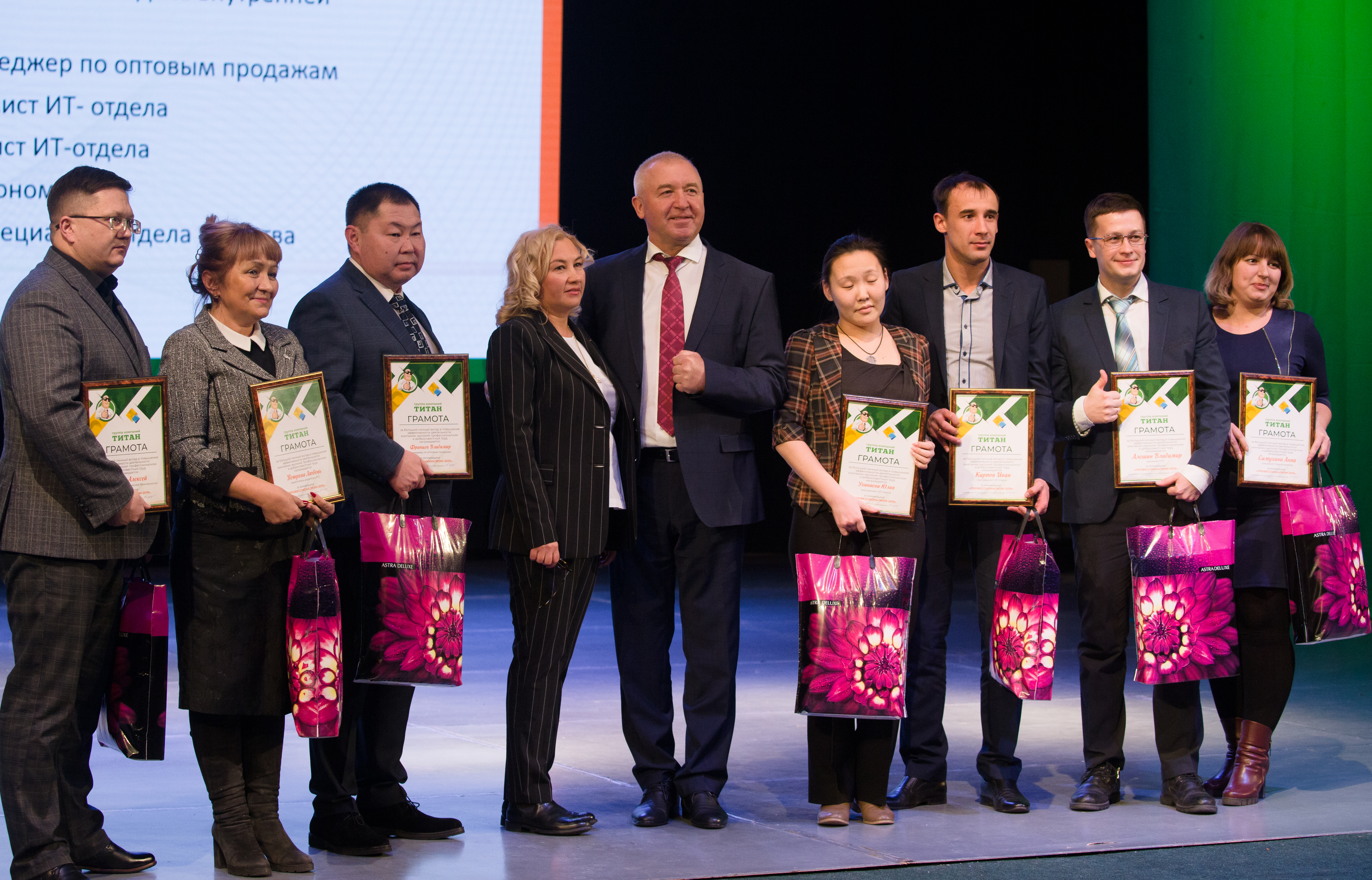 Управляющий директор ГК «Титан» Р.И.Бредний в выступлении отметила передовые предприятия и сотрудников, дала оценку работы подразделениям компании. В заключении, Вадим Витальевич и Раиса Иннокентьевна наградили лучших сотрудников и подразделения дипломами, премиями.